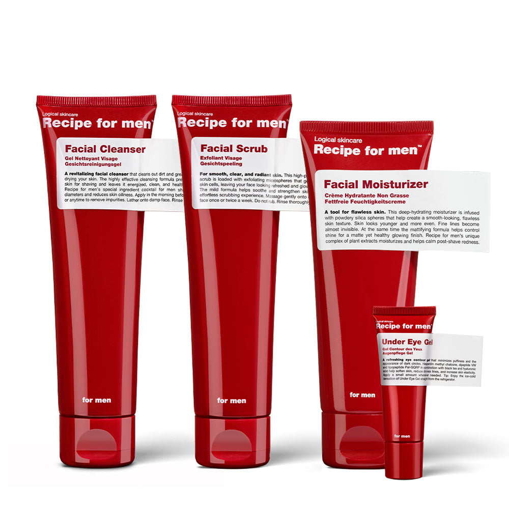 A logical Complete Face Routine. Cleanse with Facial Cleanser, apply Facial Moisturizer and follow up with Under Eye Gel. Apply Facial Scrub 1-2 days per week after cleansing and before moisturizer to gently peel off dead skin cells and dull build-up leaving your face smooth, renewed, and radiant.