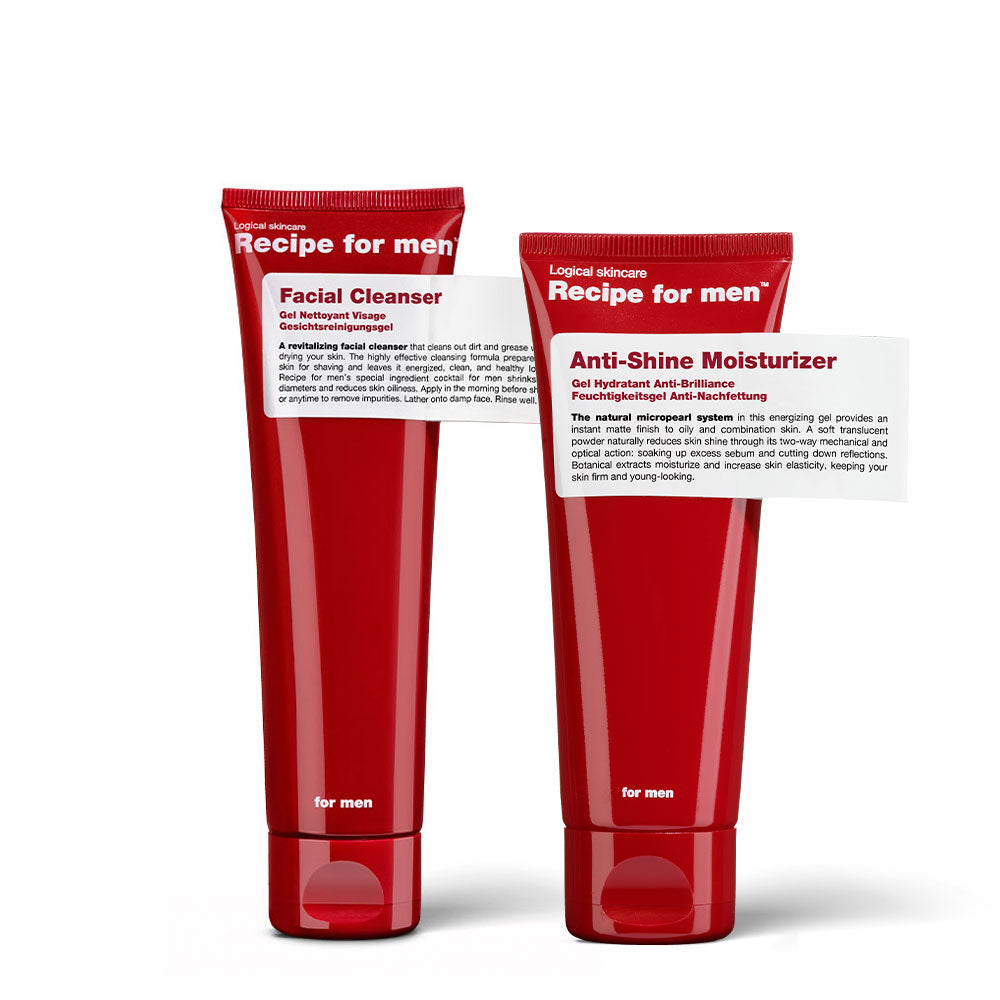 Start kit for oily/combination skin. A daily face routine that is done in 2 minutes – cleanse with Facial Cleanser, apply Anti-Shine Moisturizer, and that’s it!